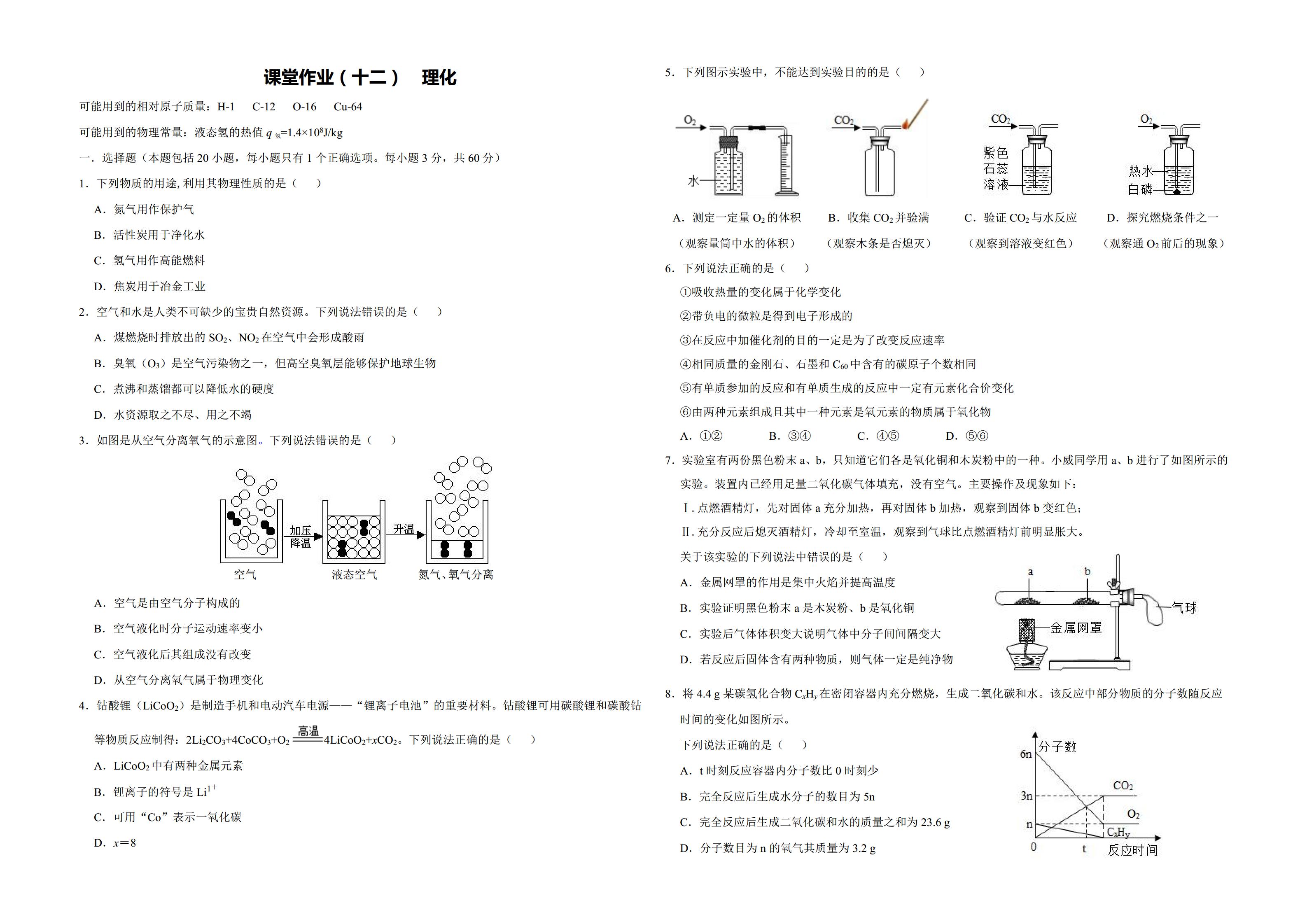 武汉六初2021-2022学年上学期12月九年级理化课堂作业(高清PDF版)