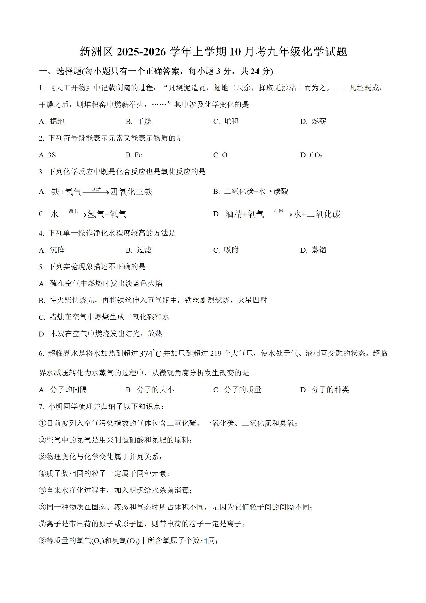 - 1 新洲区2025-2026学年上学期10月考九年级化学试题(word版含答案)