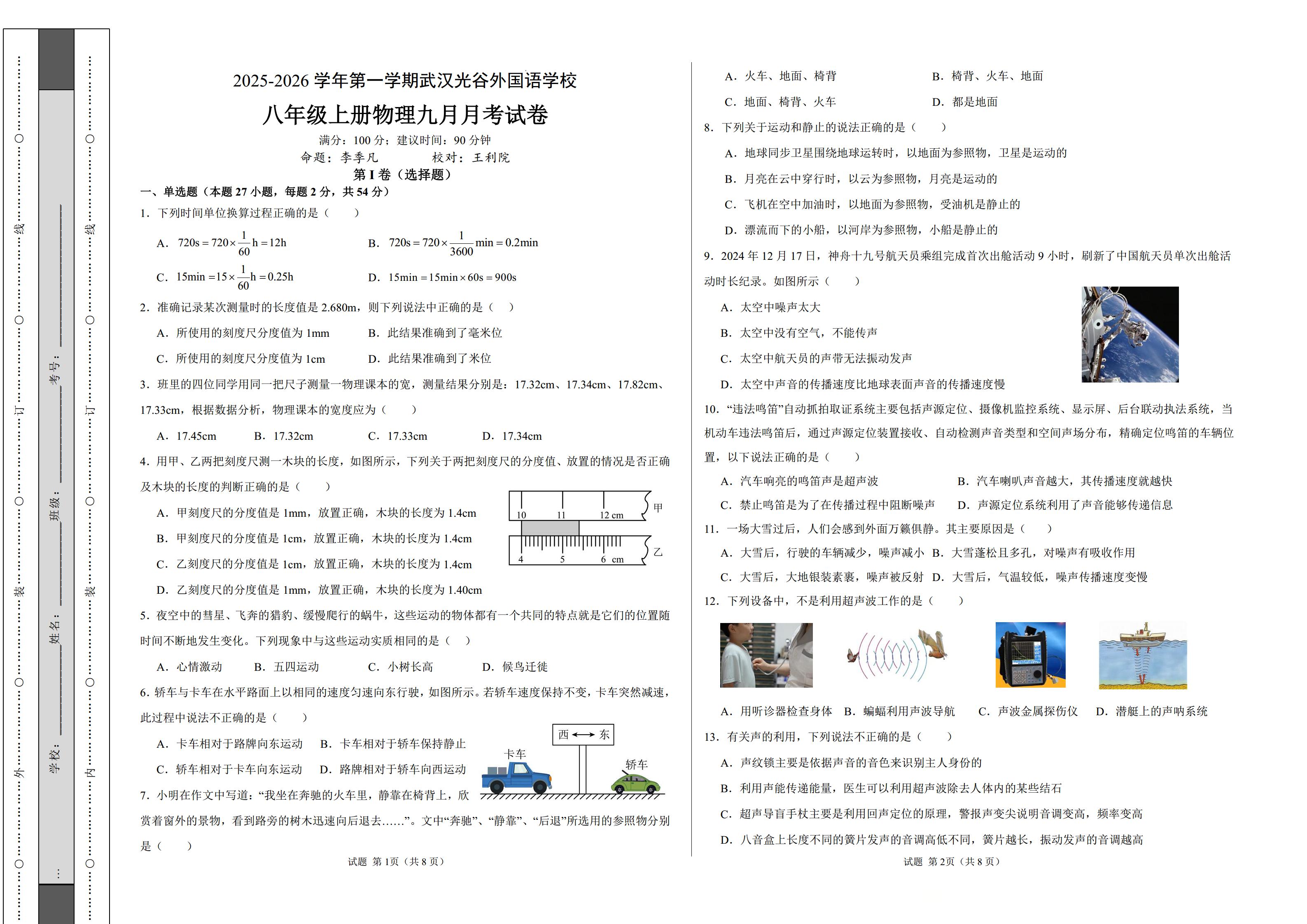- 1 武汉光谷外国语学校2025-2026学年上学期9月八年级物理试卷(高清PDF版)