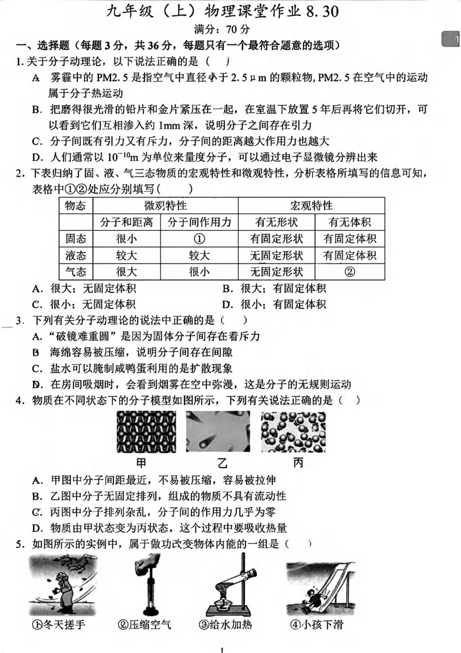 - 1 武汉二中广雅2025-2026学年九上物理课堂作业8.30(PDF版)