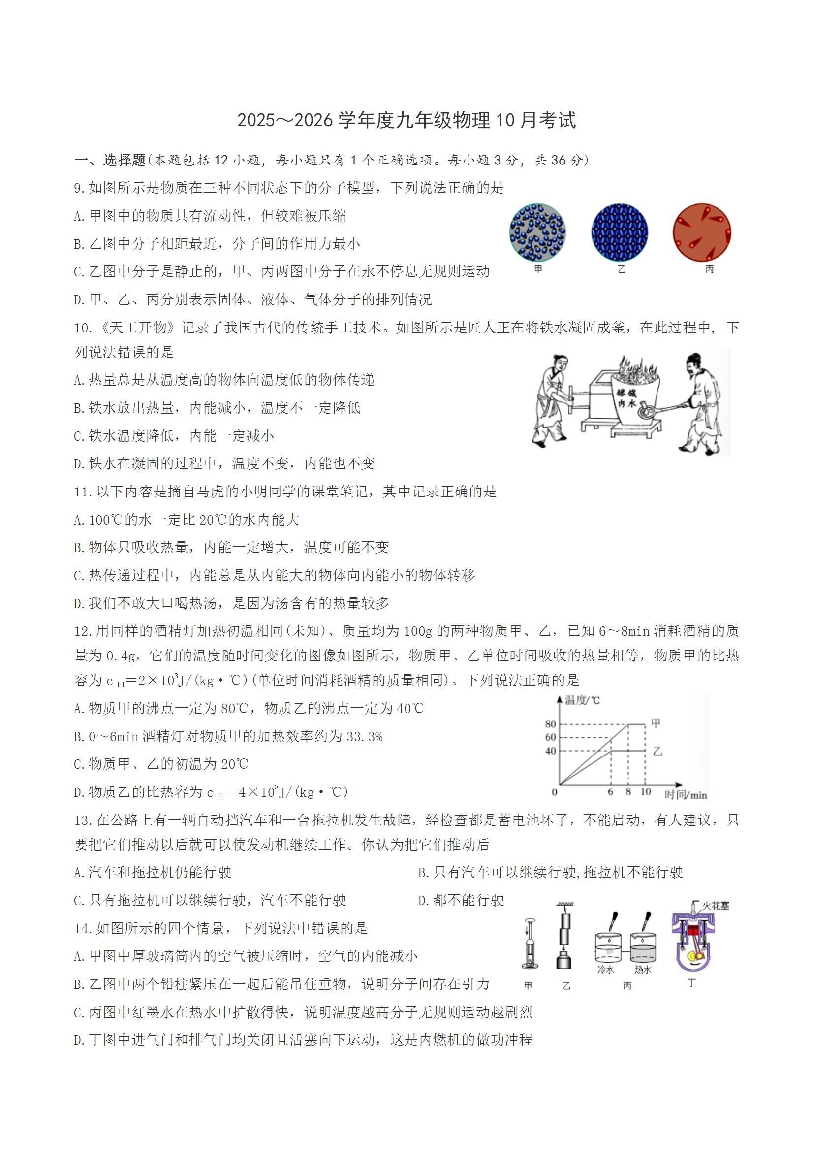 华一初2025-2026学年上学期10月九年级物理试题(word版)