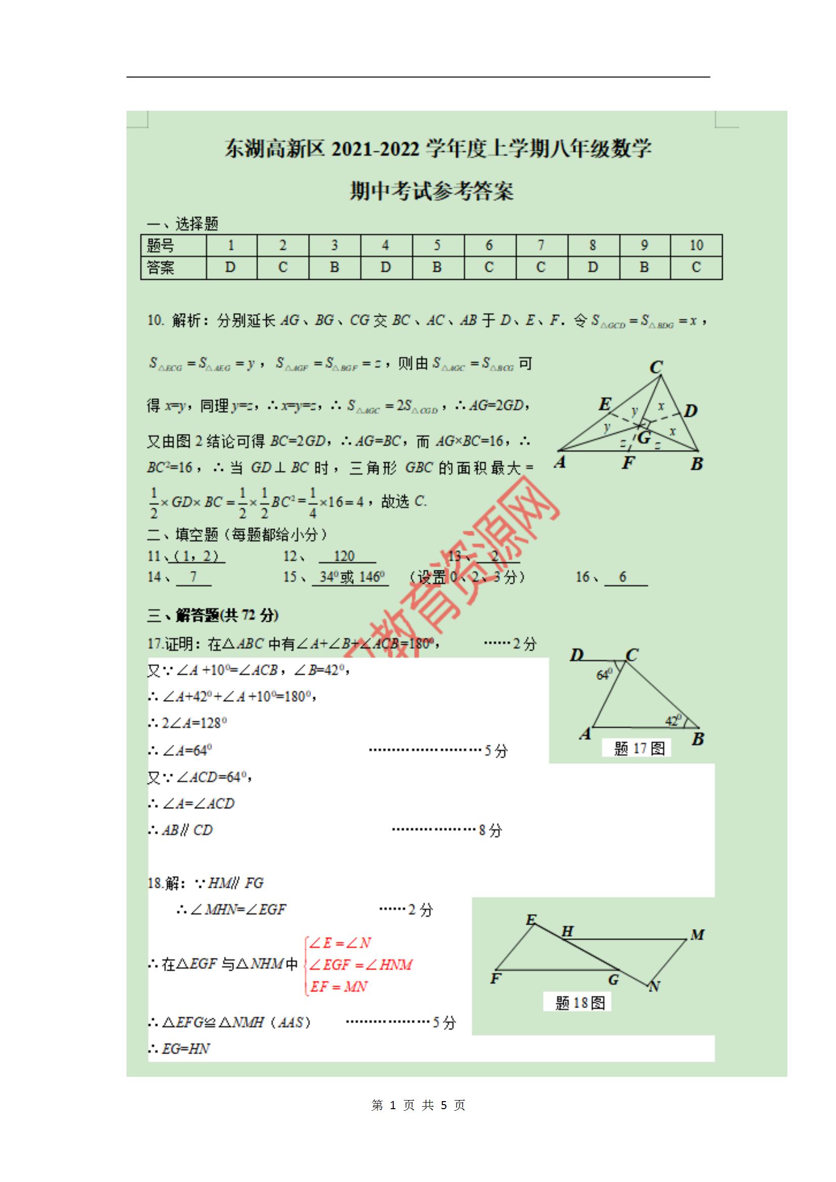 东湖高新区2021-2022学年度第一学期期中考试八年级数学标答及评分标准
