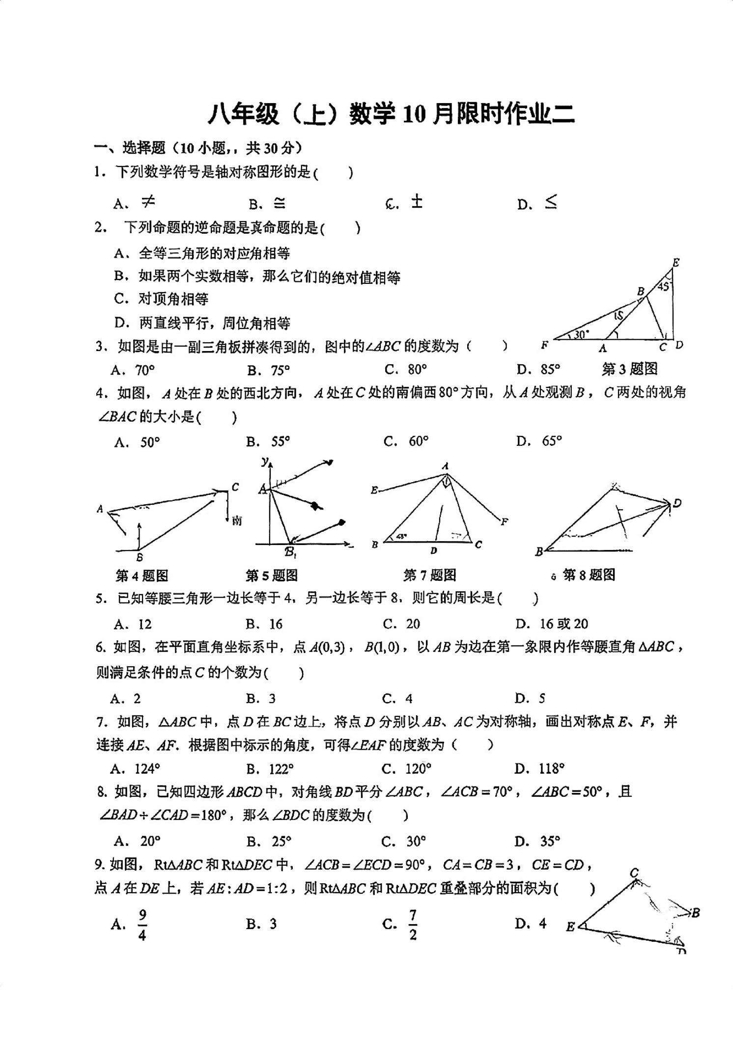 - 2 武汉经开区一初中2025-2026学年10月八年级数学独立作业(word版含答案)