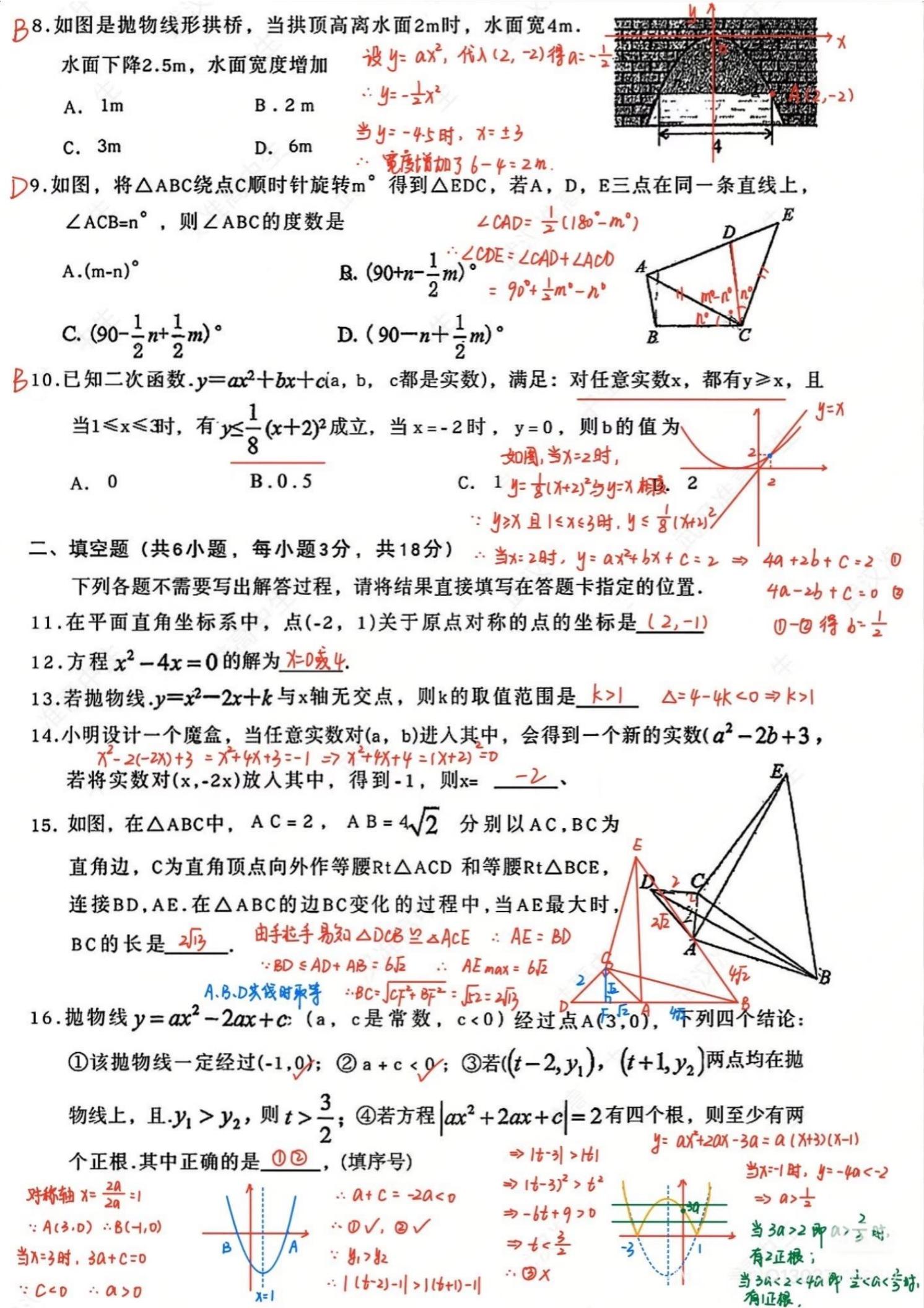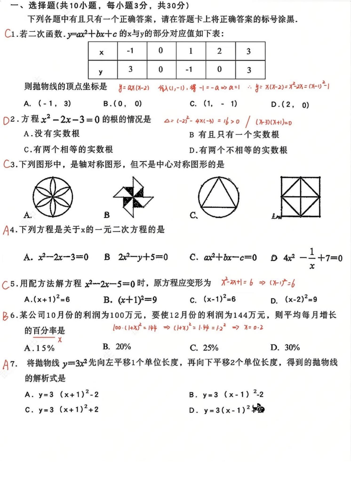 - 1 东西湖区2025-2026学年上学期期中九年级数学手写答案