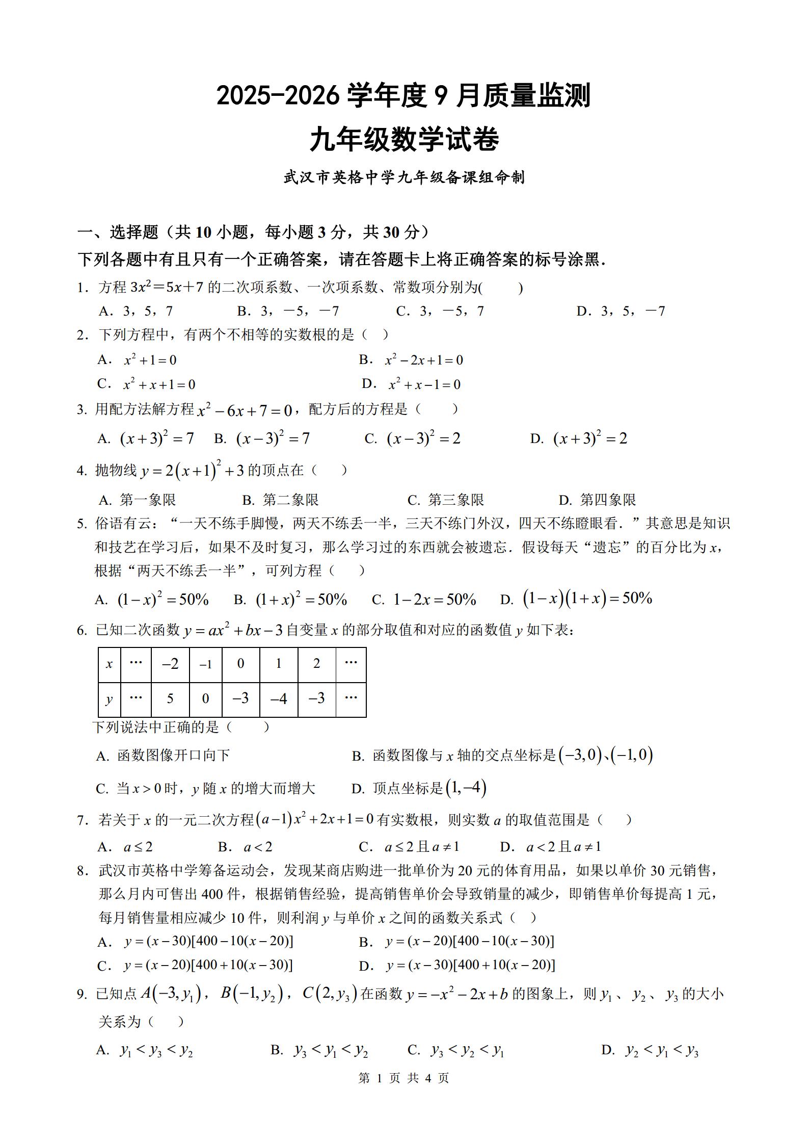 【免费】武汉市英格中学2025-2026学年度第一学期9月考九年级数学试卷(高清PDF版含答案)