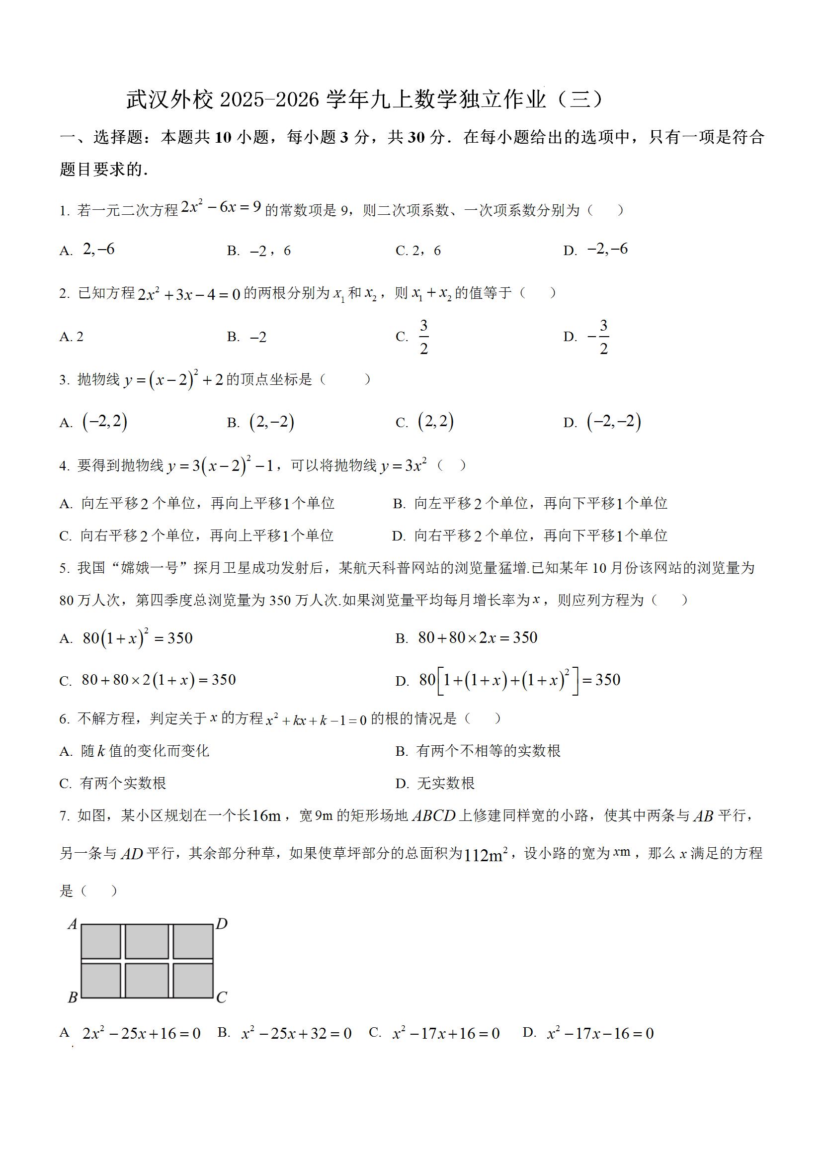 - 1 武汉外校2025-2026学年九上数学独立作业(三)(word版含答案)