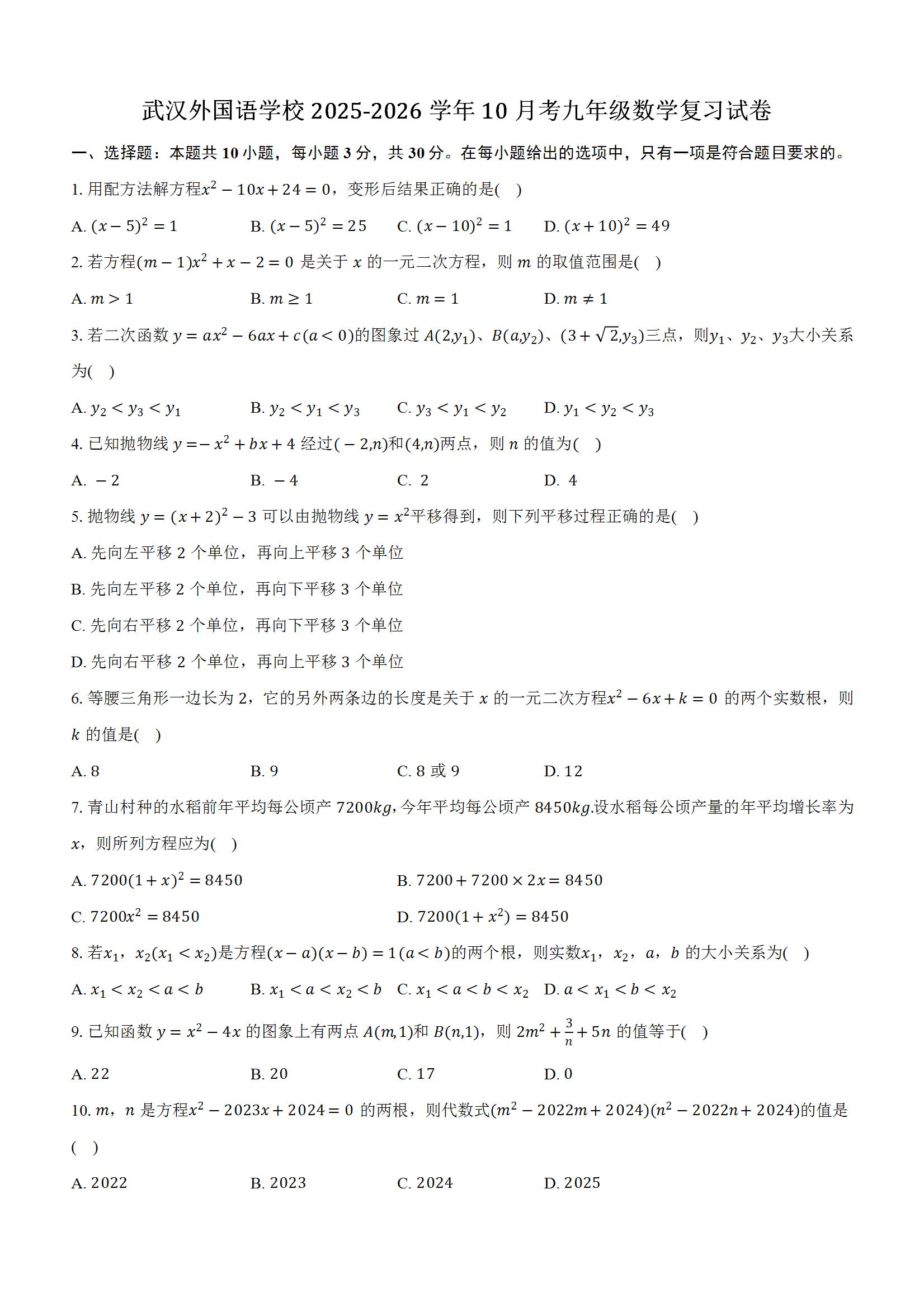 - 1 武汉外国语学校2025-2026学年上学期10月考九年级数学复习试卷(word版含答案)