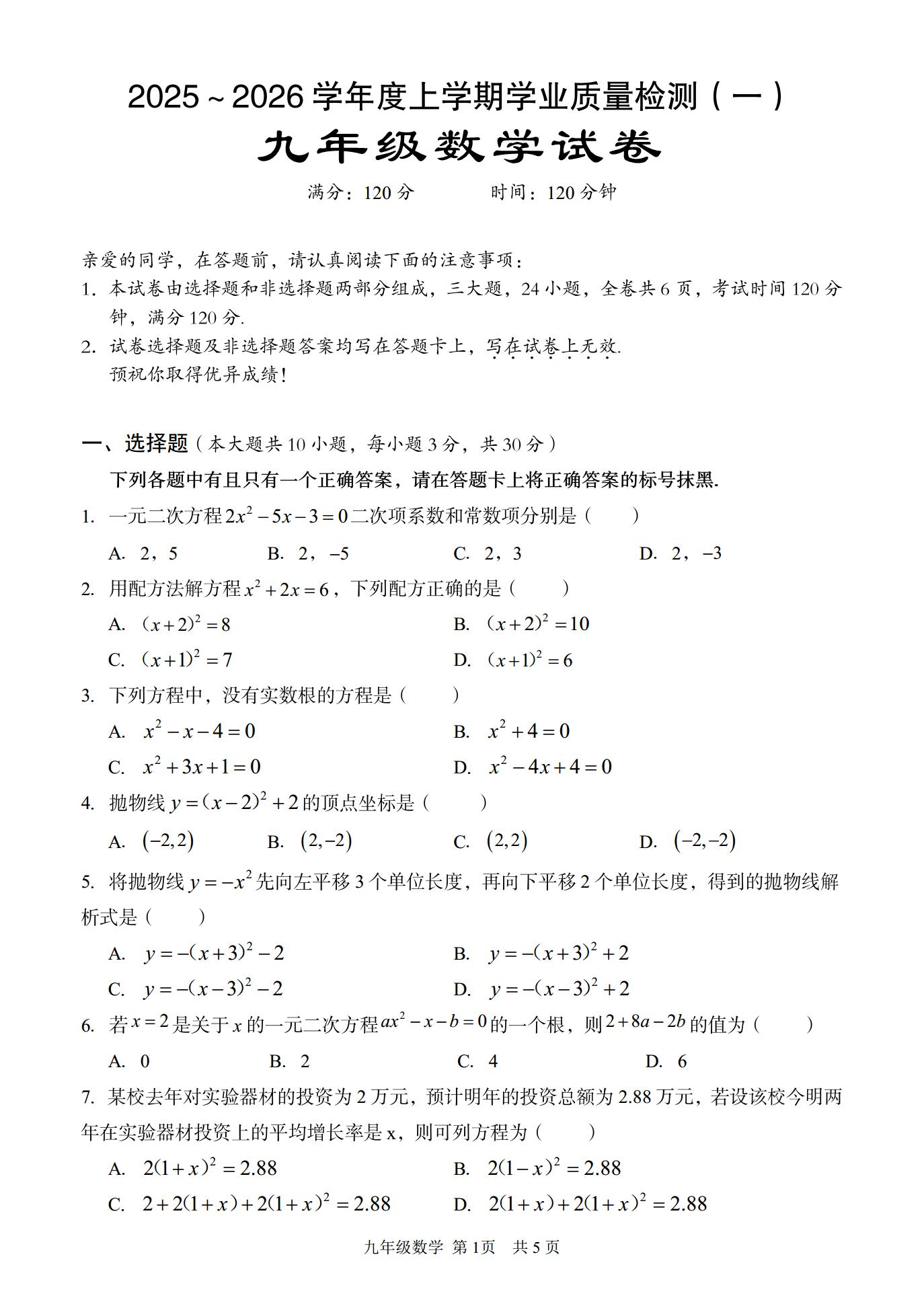 - 2 【免费】武昌区部分学校2025-2026学年上学期10月九年级数学试题(PDF版)