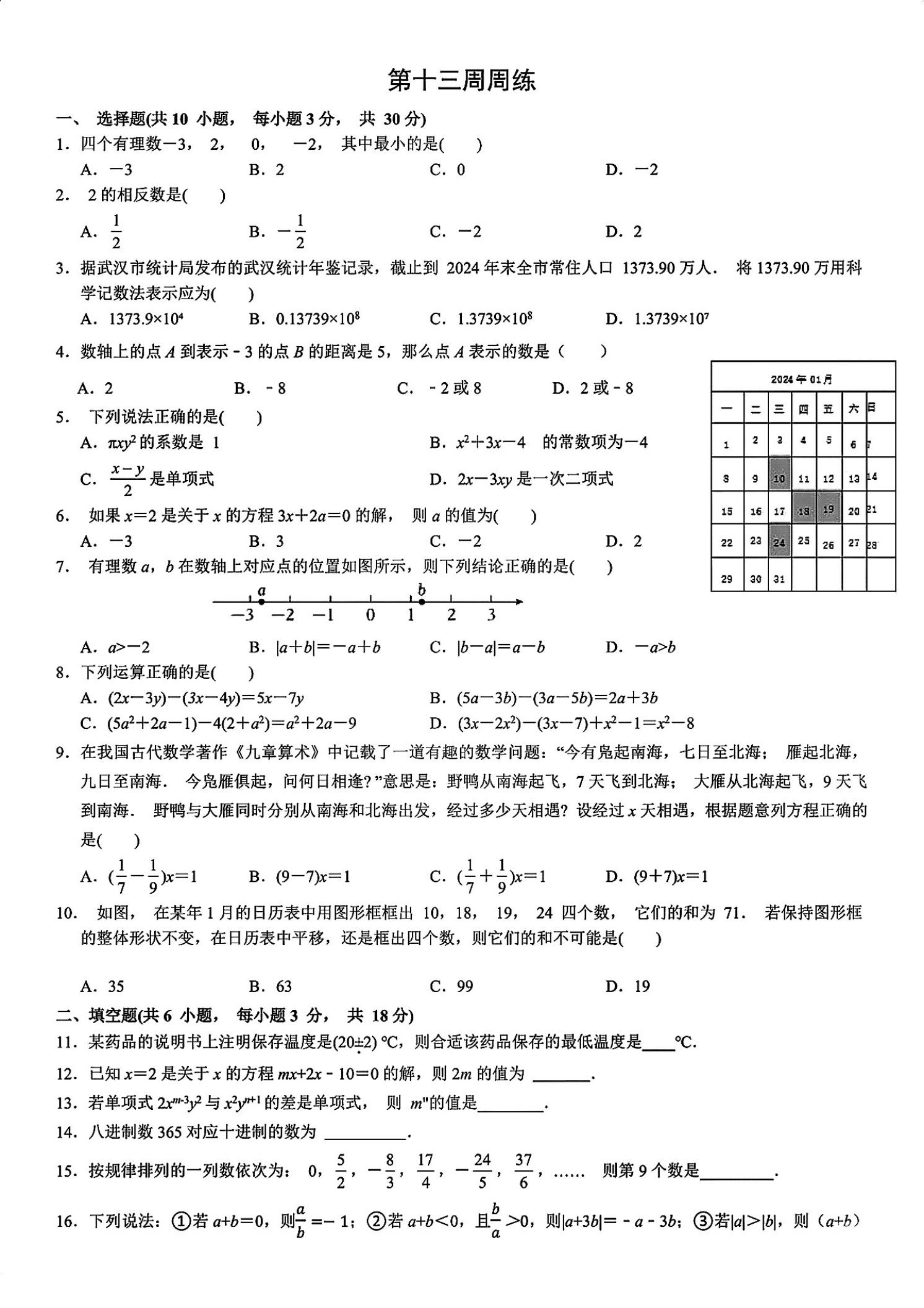 华宜寄宿2025-2026学年上学期七年级数学第13周限时作业(PDF版)
