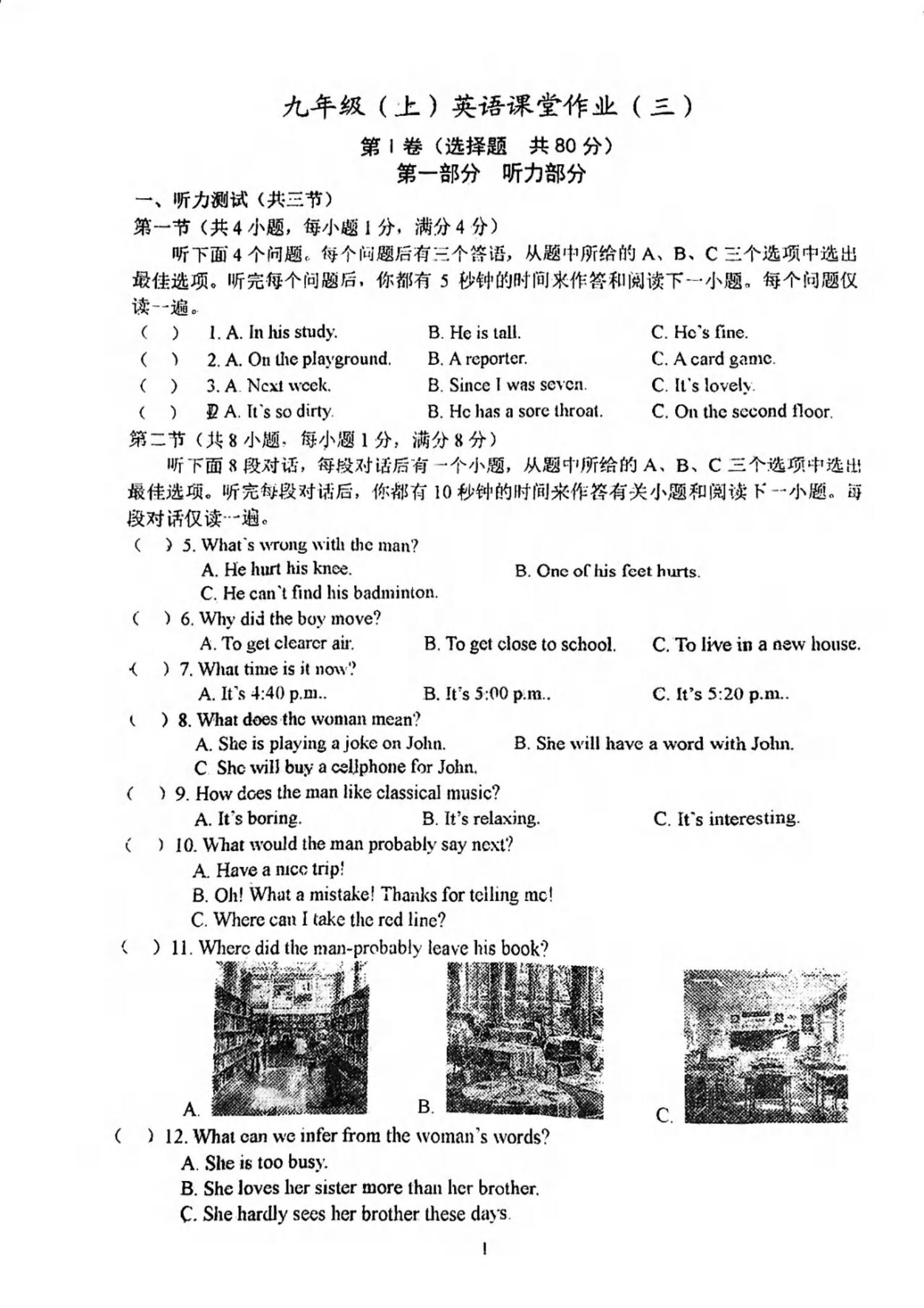 - 1 武汉二中广雅中学2025-2026学年九上英语课堂作业(三)(PDF版)