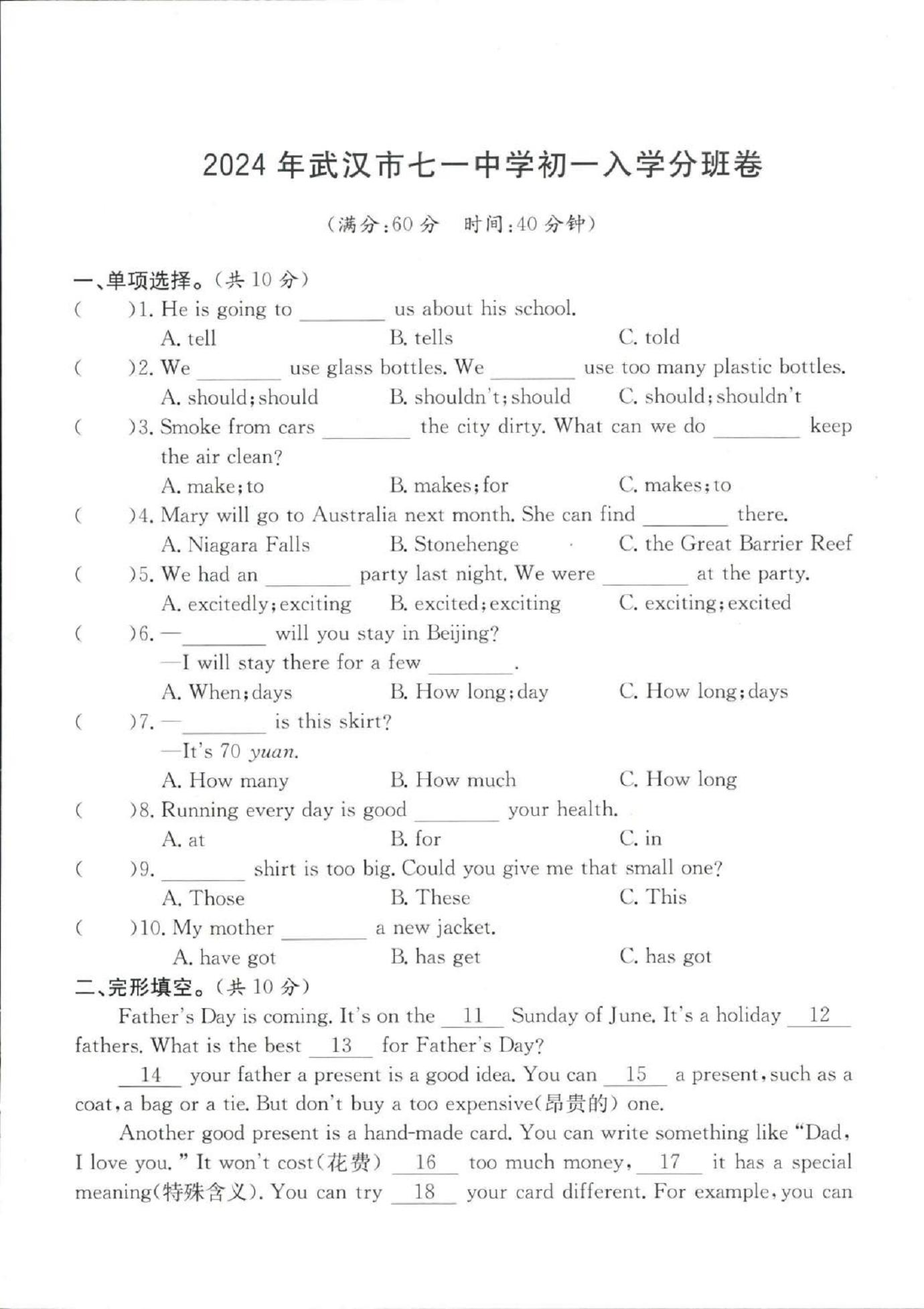 - 1 武汉名初2024年初一分班英语真题试卷(PDF版含答案)