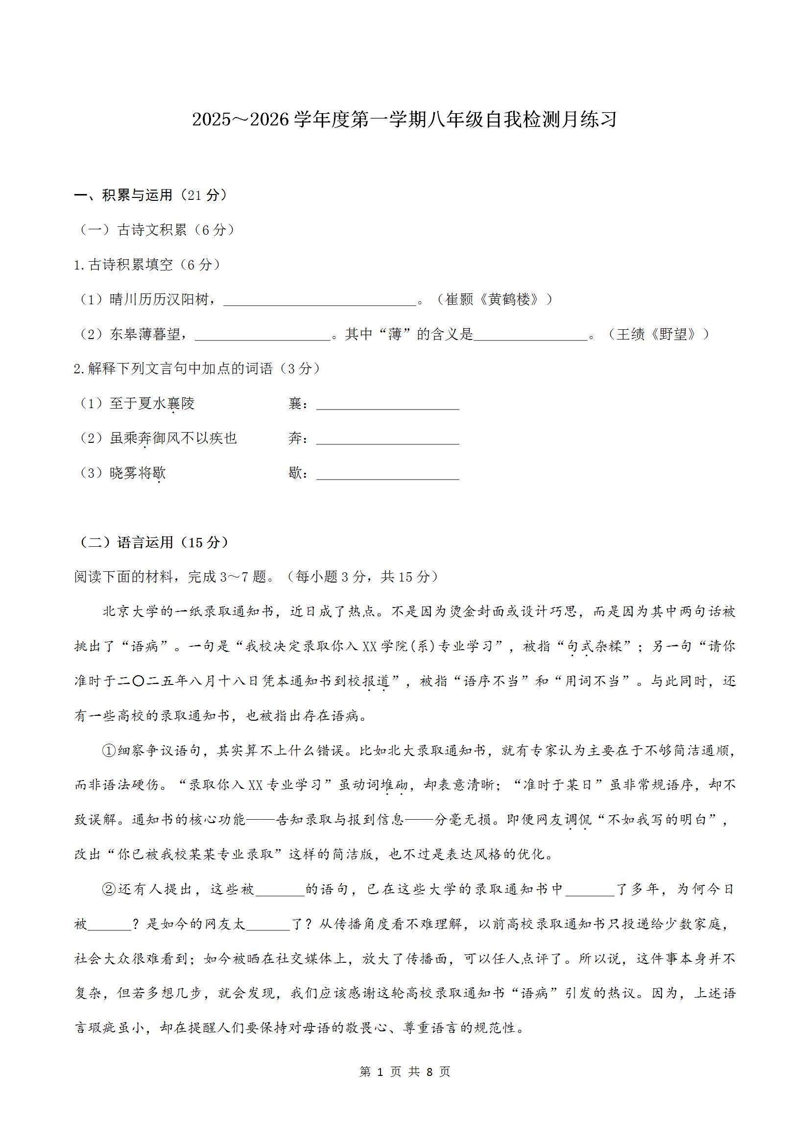 - 1 武汉光谷未来学校2025-2026学年上学期10月八年级语文试题(word版)