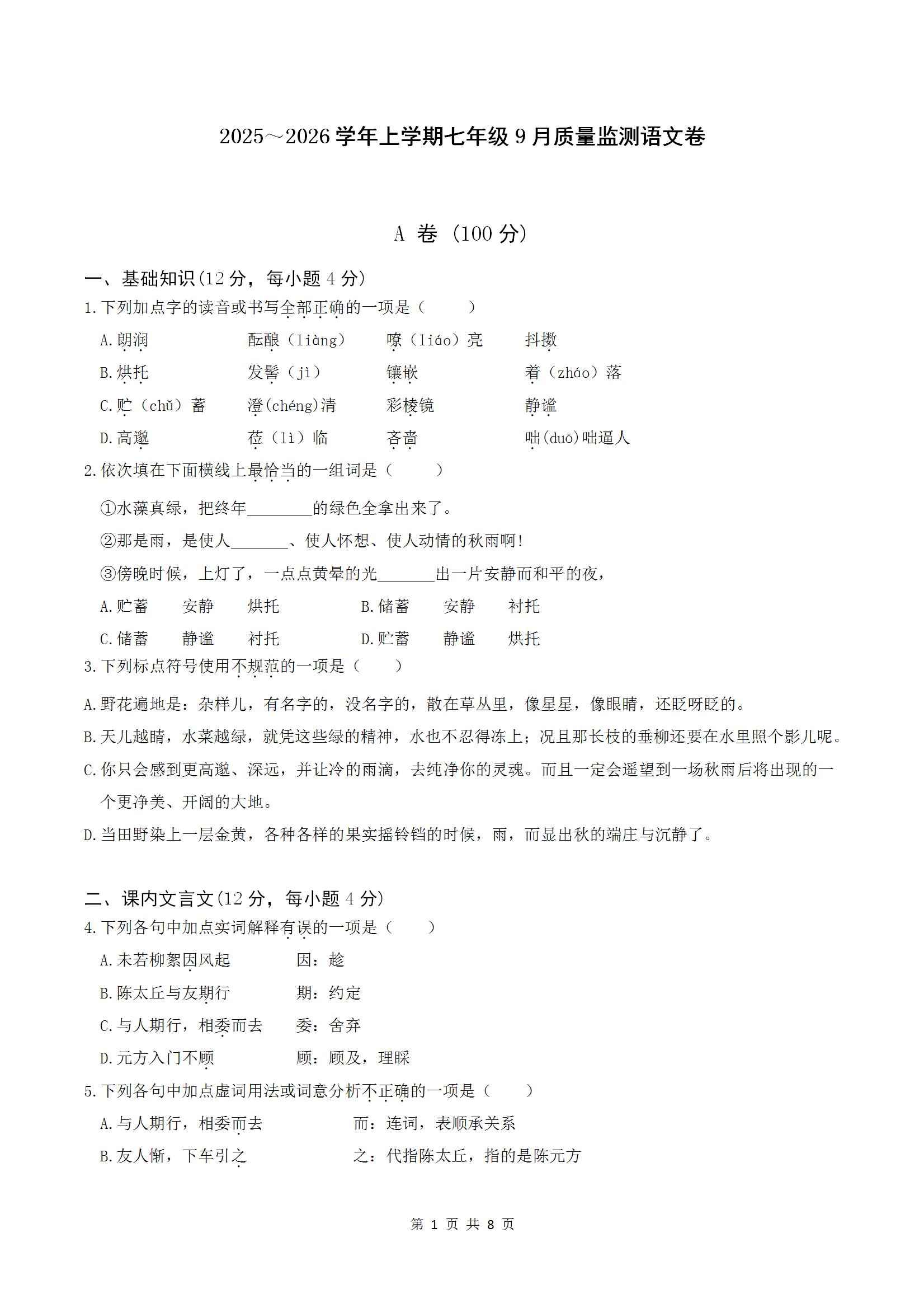 - 8 轻松导练2025-2026年七上语文第一单元综合测试卷(word版)