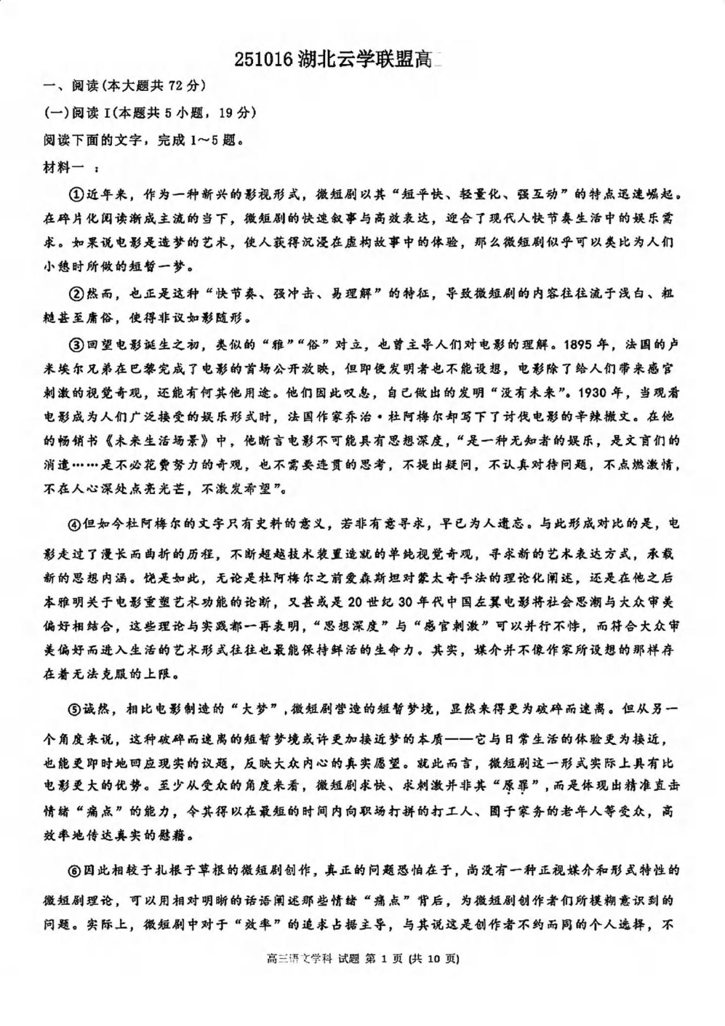 【免费】湖北云联盟2025-2026学年高三上学期10月联考语文试卷(PDF版含答案)